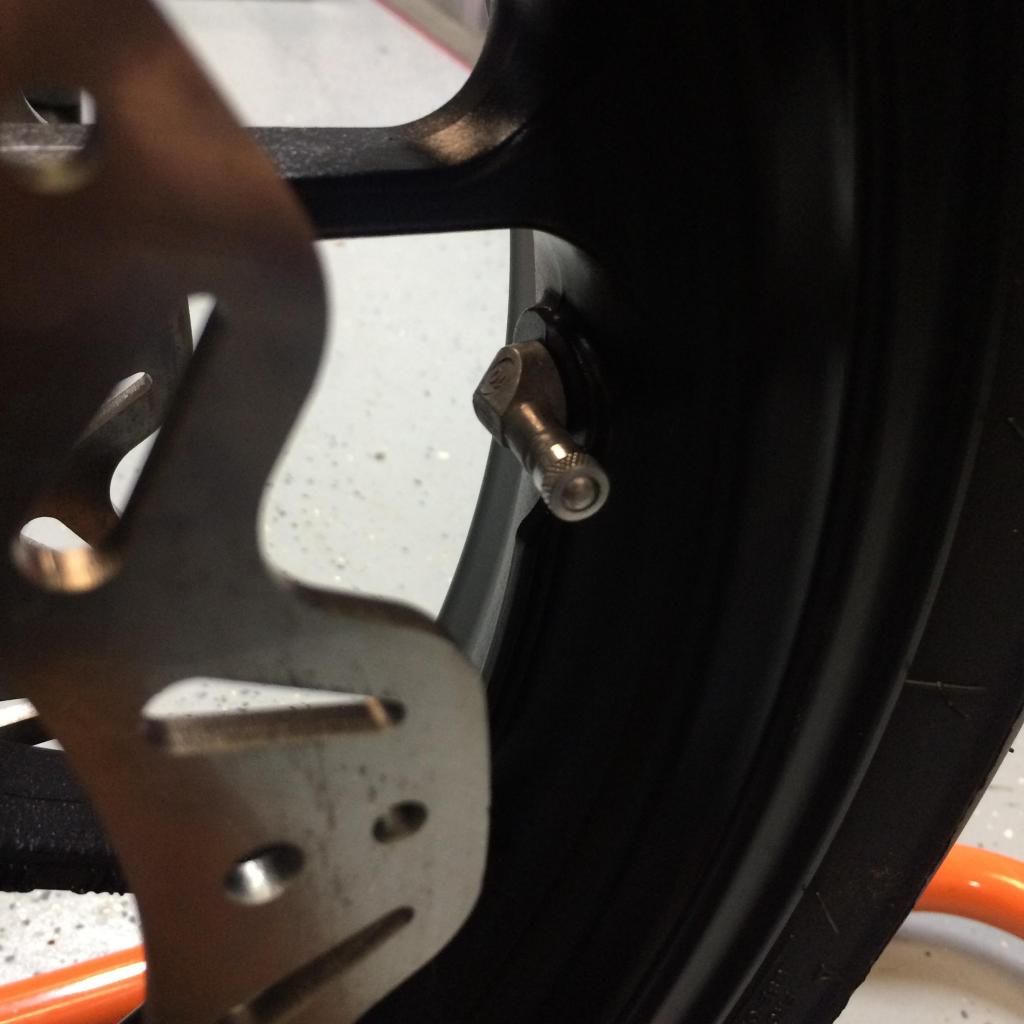 While the wheel was off and knowing the new EBC rotors where going to be 10mm bigger I wanted to put a 90 bend valve stem on for adjusting pressure up front easier.