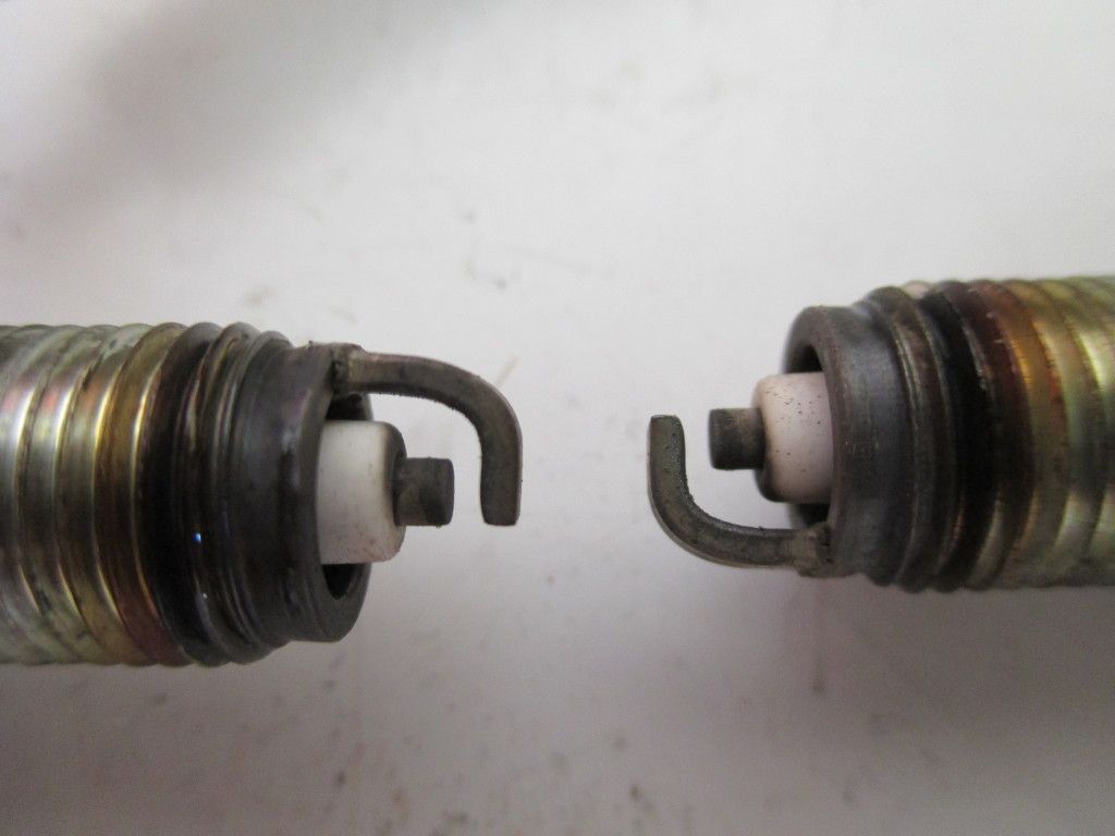 This picture is of the plugs on the FZ at 5K miles. If you look closely, you can just see some rounding off on the center electrode and a little bit of tapering of the ground wire at the open end. Looks like the erosion is slow and these do not need to be replaced.